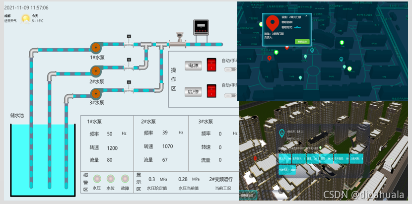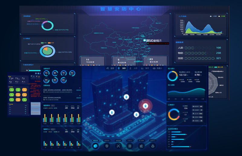 通过视频监控在线远程查看社区状况以及设备房环境的查看;在设备管理模块,对社区内的消防、安防、供电、供水等各弱电子系统设施设备运行数据查看,可视化的图表进行趋势分析,结合3D或组态动态呈现整个工作流程并通过对个别按钮操作实现远程控制;