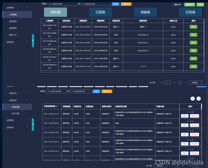 打开电脑使用自己的账号登录智慧社区物联网云平台,在系统首页查看社区出行数据、设备告警通知数量、工单状态和数量;打开告警统计模块查看详细告警内容并进行后续处理;进入设备运维模块查看今日新增的工单在线进行派单,对已经完成的工单在线验收处理;