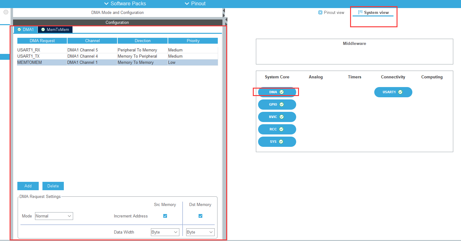 循环模式:可用于处理环形缓冲区和连续数据流(例如ADC扫描模式)。当激活循环模式后,每轮传输结束时,要传输的数据数量将自动用设置的初始值进行加载,并继续响应DMA请求。