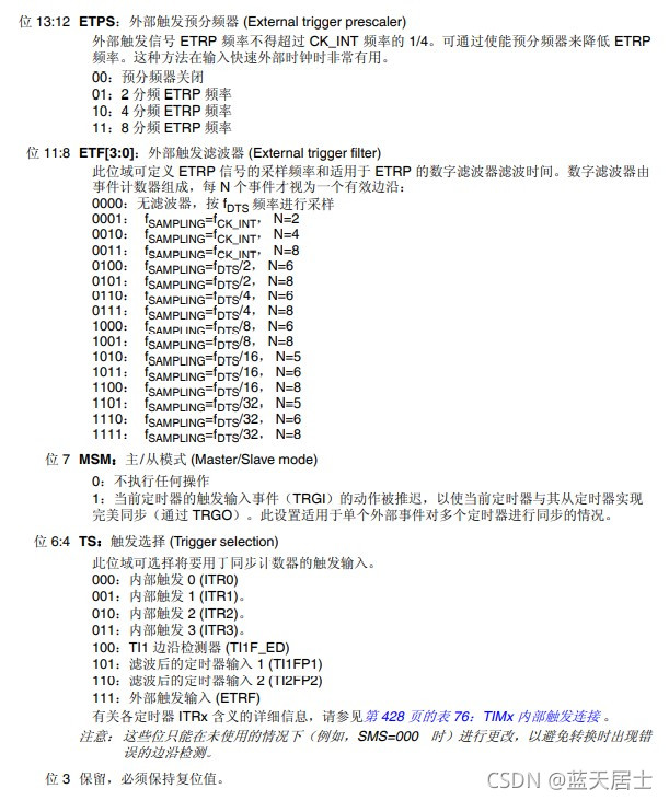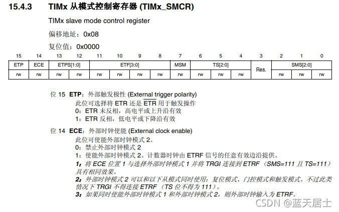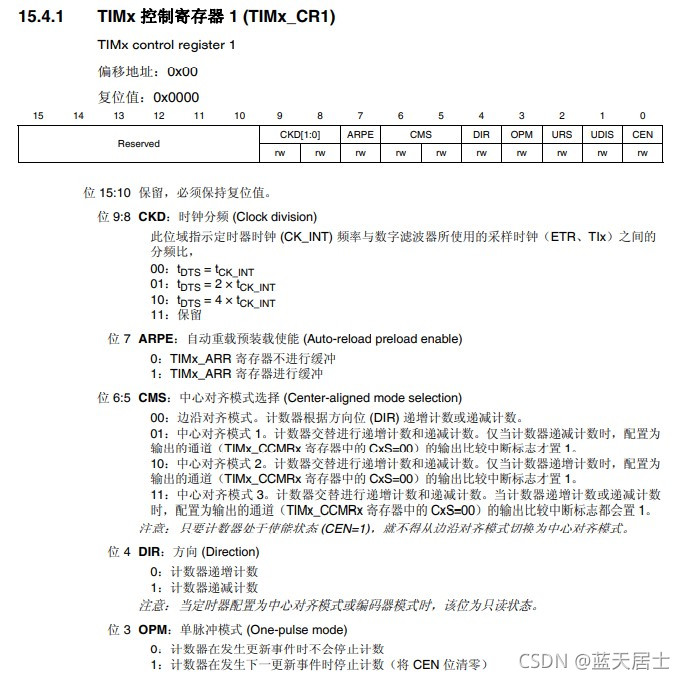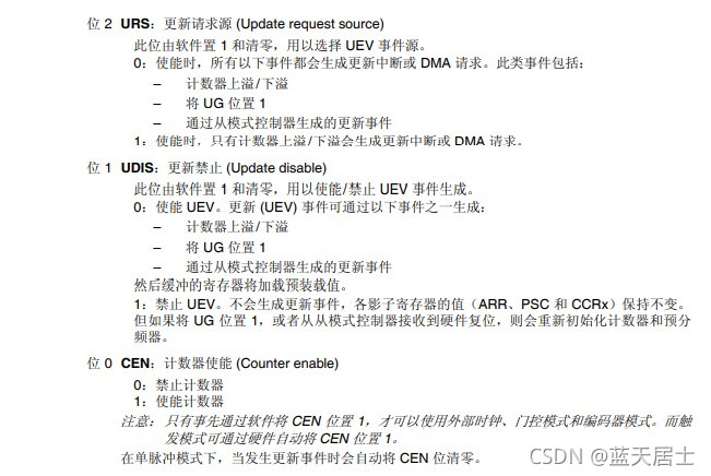 这个函数的功能是使能定时器外设。涉及到CR1寄存器,手册中对应的资料为: