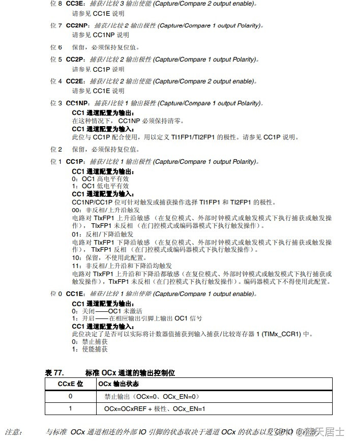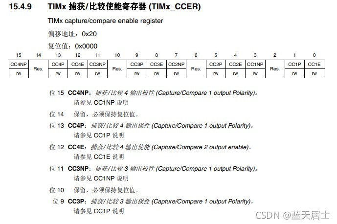这个函数的功能是使能/禁止定时器的捕获比较通道。涉及到CCER寄存器,手册中对应的资料为: