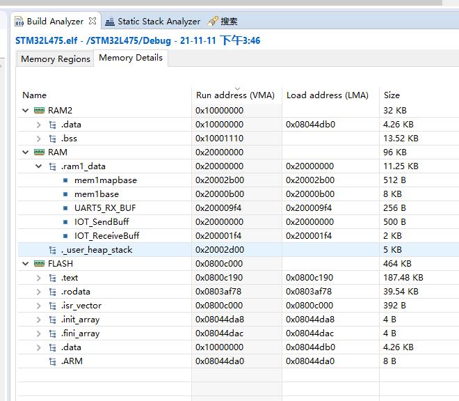 ????????STM32L475VE有两块内部SRAM,SRAM2的起始地址在? 0x10000000,大小为32k;SRAM1的起始地址在 0x20000000,大小为96k;全计128k。其中SRAM2在低功耗模式下是可以实现不掉电的,即内容不丢失。默认情况下,变量是分配在SRAM1,这个是由ld链接文件决定的。可以通过修改ld链接文件重新定义变量的分配区域。