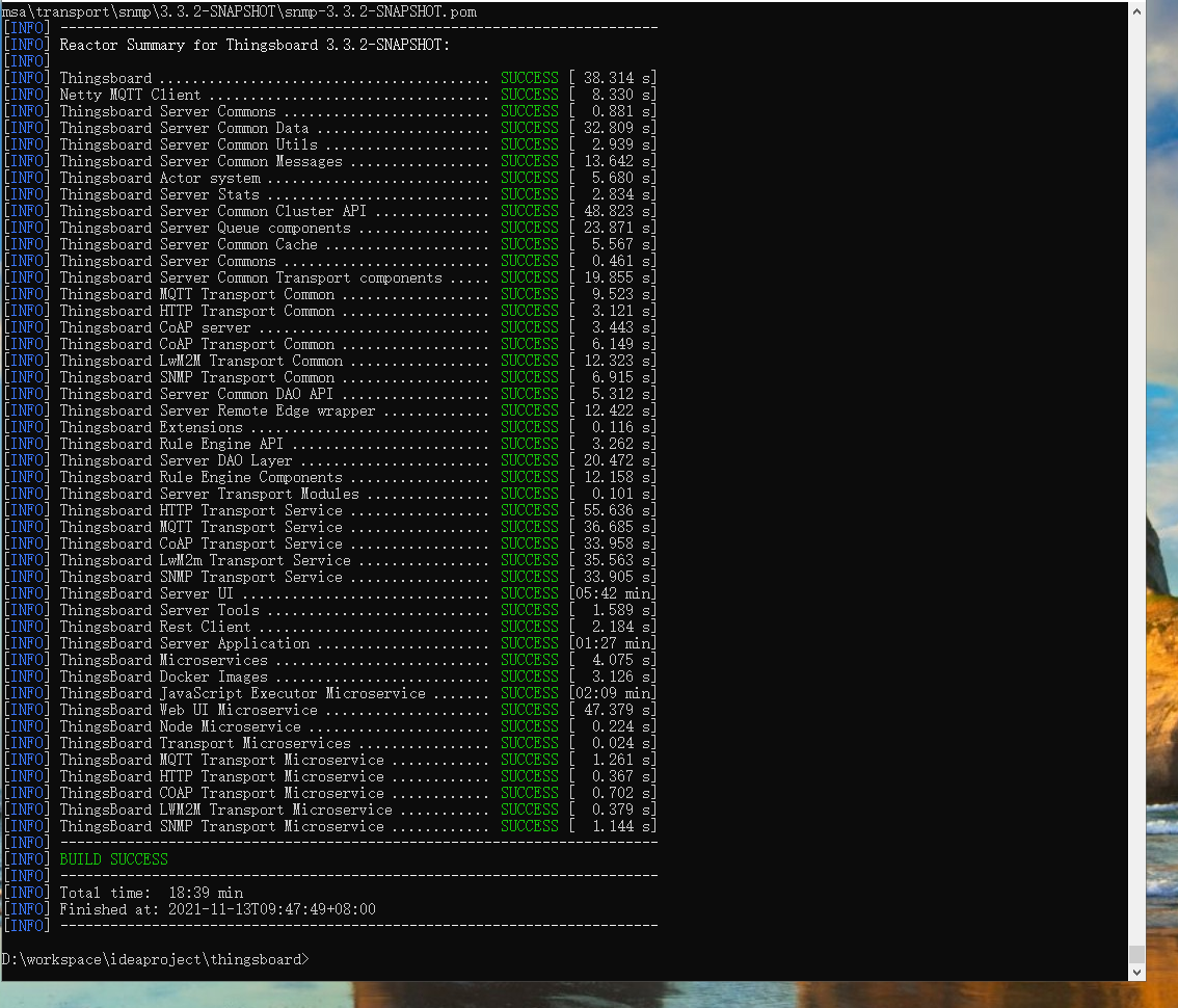 在thingsboard项目目录下运行maven install指令开始编译安装: