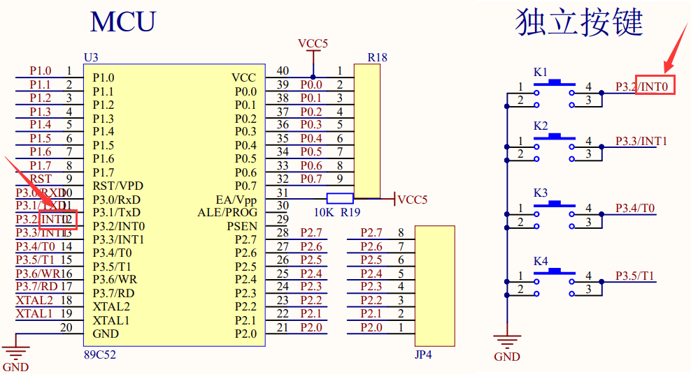 - 51有两个中断口,分别为P3^1,P3^2.各自对应按键K1和K2,可以在其中选一个做中断源,需要注意,中断0对应中断号0,中断1对应中断号2,这里选择中断0.