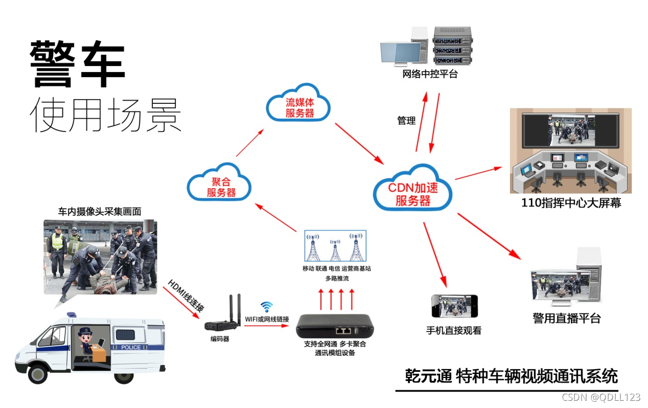 ? ? ? ? 因此,执法车高清监控系统的主要功能系统包括:1)高清车载视频监控子系统,与GIS融合的实时视频观看;2)结合GIS的定位管理子系统,以及GIS与通信控制融合的可视化指挥系统;3)融合音视频通话、集群对讲的指挥控制单兵子系统。