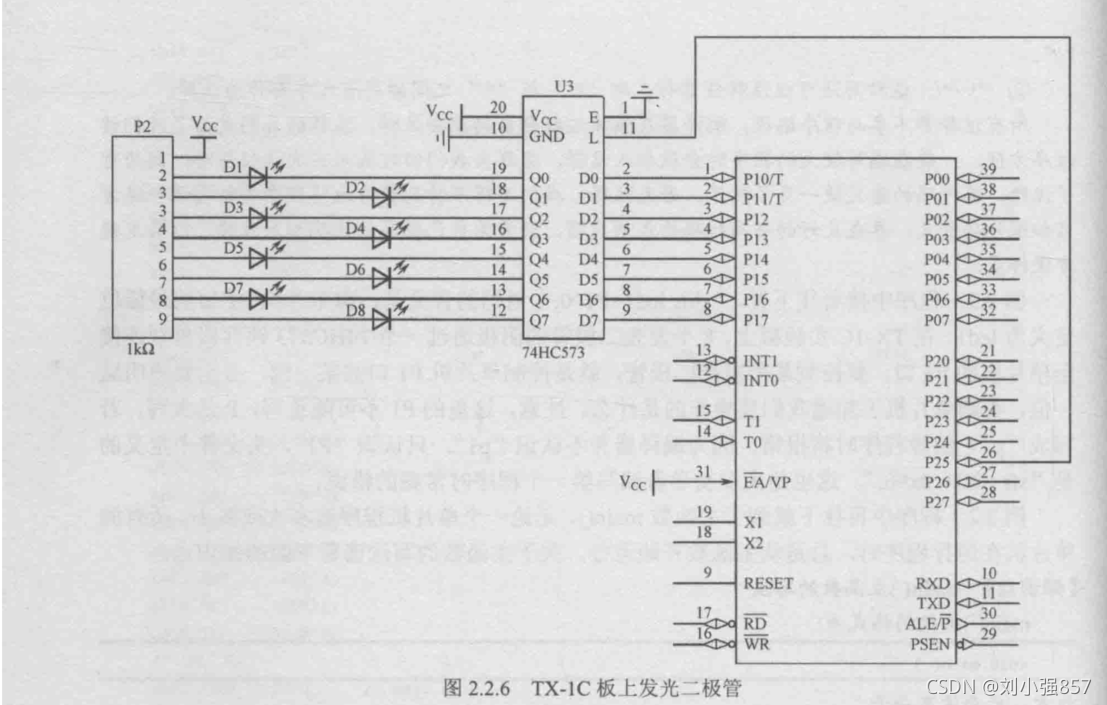 ?/*点亮第一个发光二极管,led=0,就是P1的第一个口=0,让他为低电平。二极管正极为高电平,负极连接的P1^0给出为低电平,则发光二极管有电压产生,电流流过,发亮,其他没定义的默认都高电平,两端高电平无压差产生,不亮。? */ }