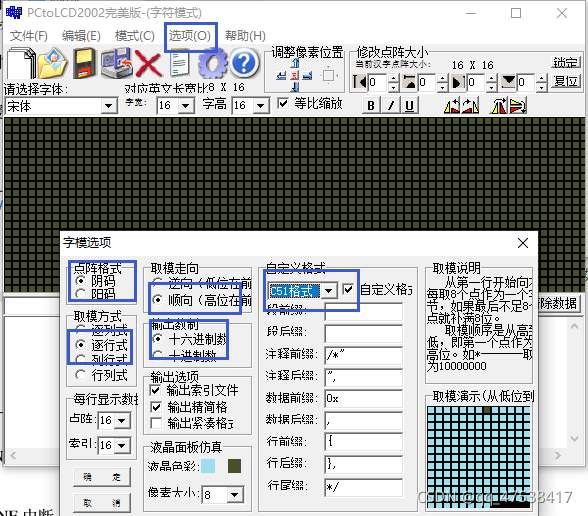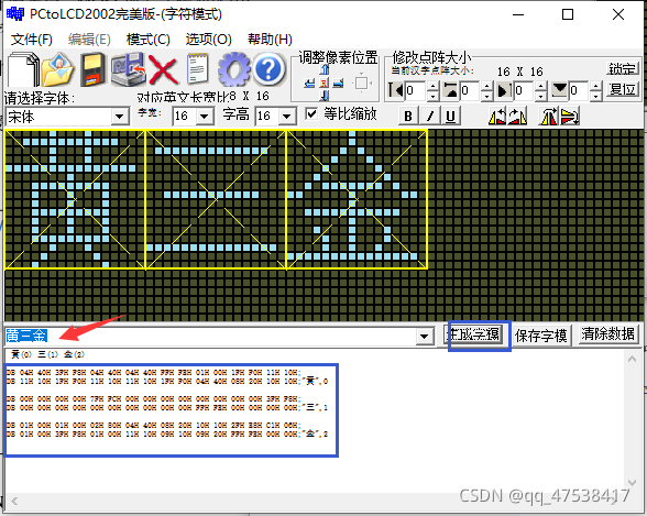 ?在文字输入区输入目标文字,点击生成字模,得到结果如下图