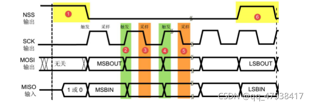 这是一个主机的通讯时序。NSS、SCK、MOSI 信号都由主机控制产生,而 MISO 的信号由从机 产生,主机通过该信号线读取从机的数据。MOSI与MISO的信号只在NSS为低电平的时候才有 效,在SCK的每个时钟周期MOSI和MISO传输一位数据。?
