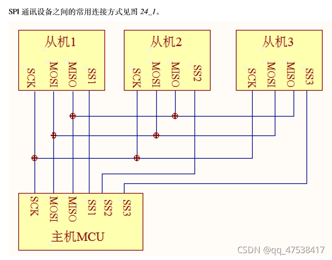 (1) SS*(*SlaveSelect):从设备选择信号线,常称为片选信号线,也称为NSS、CS,以下用NSS 表示。当有多个 SPI 从设备与 SPI 主机相连时,设备的其它信号线 SCK、MOSI 及 MISO 同时并联到相同的SPI总线上,即无论有多少个从设备,都共同只使用这3条总线;而每 个从设备都有独立的这一条NSS信号线,本信号线独占主机的一个引脚,即有多少个从设 备,就有多少条片选信号线。I2C协议中通过设备地址来寻址、选中总线上的某个设备并与?其进行通讯;而SPI协议中没有设备地址,它使用NSS信号线来寻址,当主机要选择从设 备时,把该从设备的NSS信号线设置为低电平,该从设备即被选中,即片选有效,接着主 机开始与被选中的从设备进行SPI通讯。所以SPI通讯以NSS线置低电平为开始信号,以 NSS线被拉高作为结束信号。