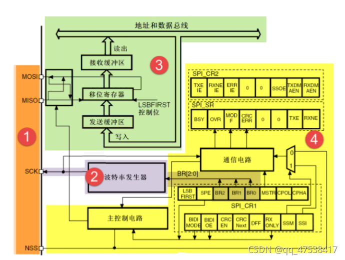 (3) MOSI(MasterOutput,SlaveInput):主设备输出/从设备输入引脚。主机的数据从这条信号线 输出,从机由这条信号线读入主机发送的数据,即这条线上数据的方向为主机到从机。