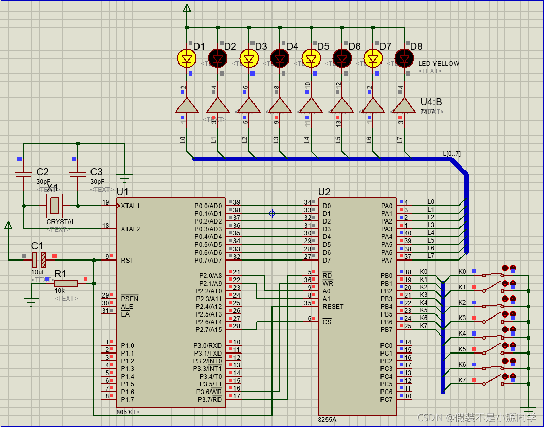 一、8255与8051单片机的连接要求: 8255的片选信号CS连到8051的P2.7,端口地址选择信号A1、A0由P2.1、P2.0提供。画出Proteus电路,分析8255的PA、PB、PC及控制口的地址。编程实现8255的PA口按方式0输出,PB口按方式0输入,将PB口外接8个开关,开关的状态通过PA口外接的8个LED灯反映出来。利用Proteus进行仿真。