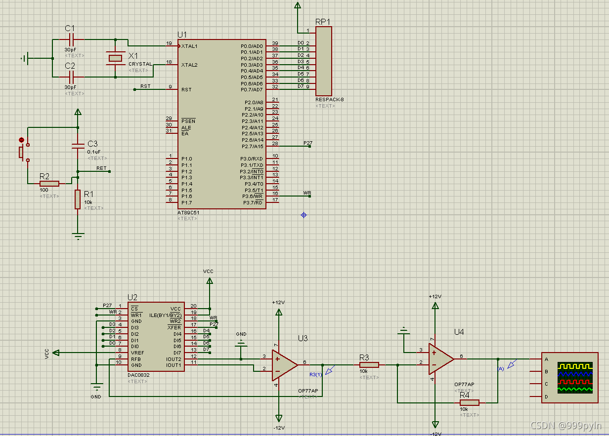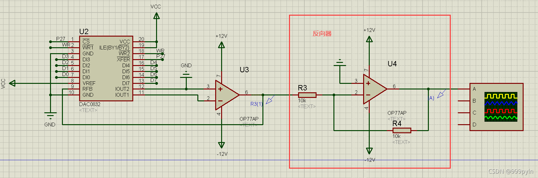 ????????????????单片机控制DAC0832的片选和寄存器选通引脚,并且对DAC输出波形数据,最终得到DAC输出的模拟量。由于DAC0832输出的模拟量是电流值,因此加一个运放可以得到与参考电压反向的输出电压值,随后加一个反向器就会得到的希望的正向电压,用示波器采集。