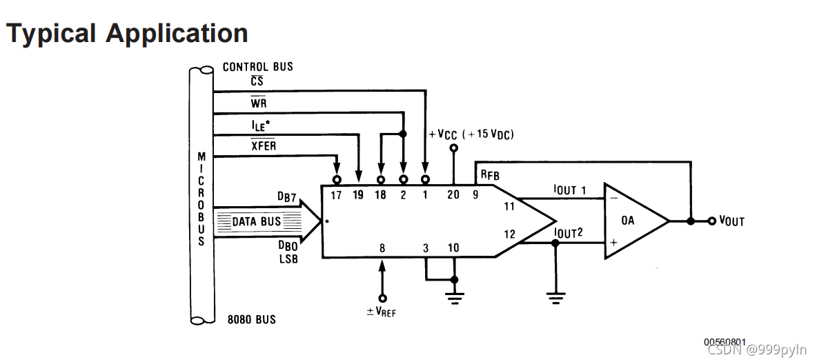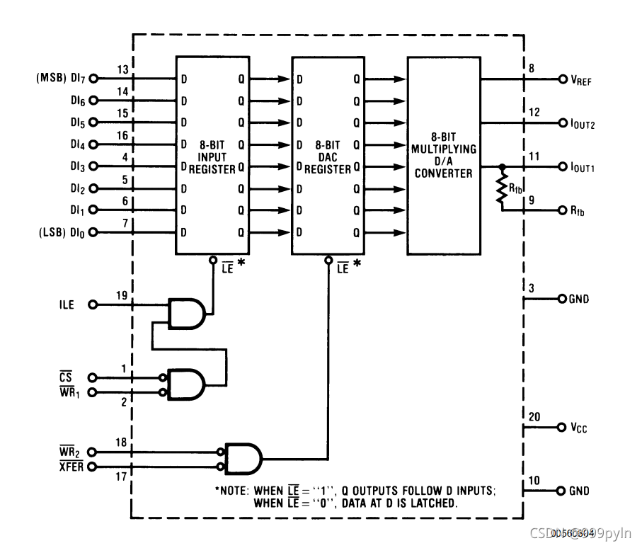 ????????????????2.ILE高CS、WR1低选通,使得数据可以通过输入寄存器;WR2、XFER低选通,使得数据通过DAC寄存器直接进入D/A转换器进行转换。输出Iout1、Iout2。