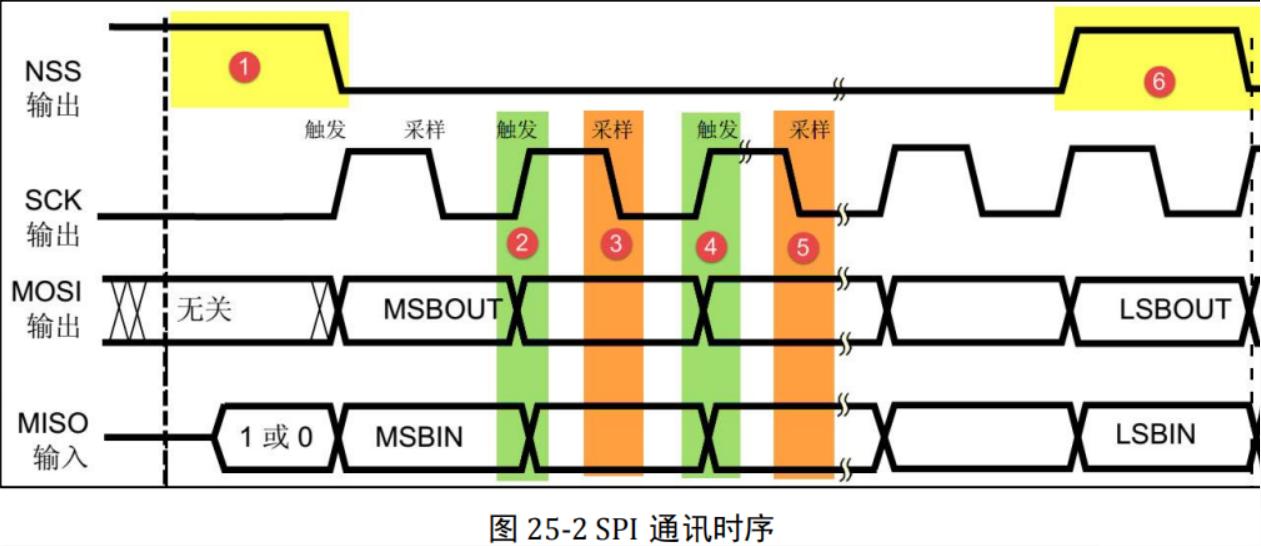 通讯的起始和停止信号 ? 在图 25-2 中的标号① 处, NSS 信号线由高变低,是 SPI 通讯的起始信号。 NSS 是每个 从机各自独占的信号线,当从机在自己的 NSS 线检测到起始信号后,就知道自己被主机选 中了,开始准备与主机通讯。在图中的标号⑥ 处, NSS 信号由低变高,是 SPI 通讯的停止 信号,表示本次通讯结束,从机的选中状态被取消。