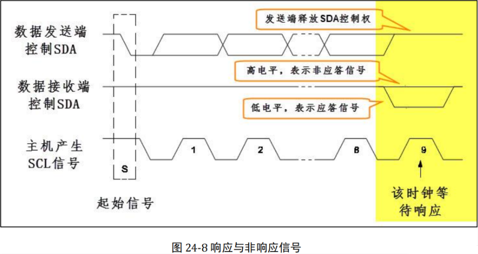?当SDA传输数据后,接收方对接受到的数据进行一个应答。如果希望继续进行传输数据,则回应应答信号(低电平),否则回应非应答信号(高电平)