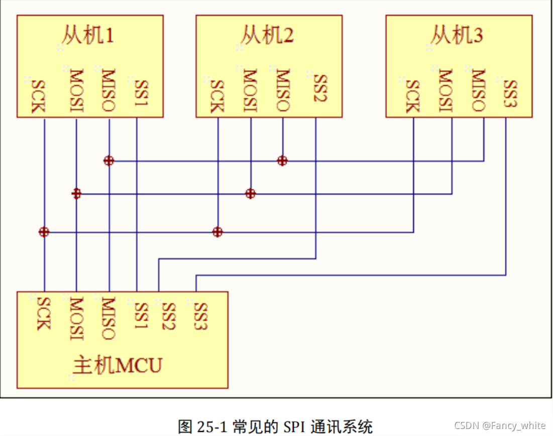 SS( Slave Select):从设备选择信号线,常称为片选信号线。 SCK (Serial Clock):时钟信号线,用于通讯数据同步。 MOSI (Master Output, Slave Input):主设备输出/从设备输入引脚。 MISO(Master Input,,Slave Output):主设备输入/从设备输出引脚。