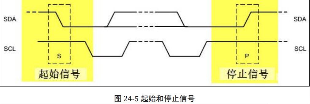 当 SCL 线是高电平时 SDA 线从高电平向低电平切换,这个情况表示通讯的起始。 当 SCL 是高电平时 SDA线由低电平向高电平切换,表示通讯的停止。