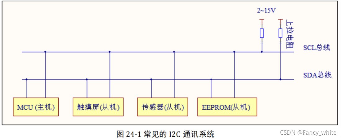 ????????I2C 通讯协议 (Inter - Integrated Circuit) 是由 Phiilps 公司开发的,由于它引脚少,硬件实 现简单,可扩展性强,不需要 USART 、 CAN 等通讯协议的外部收发设备,现在被广泛地 使用在系统内多个集成电路 (IC) 间的通讯。 物理层