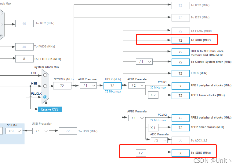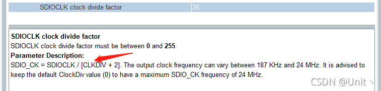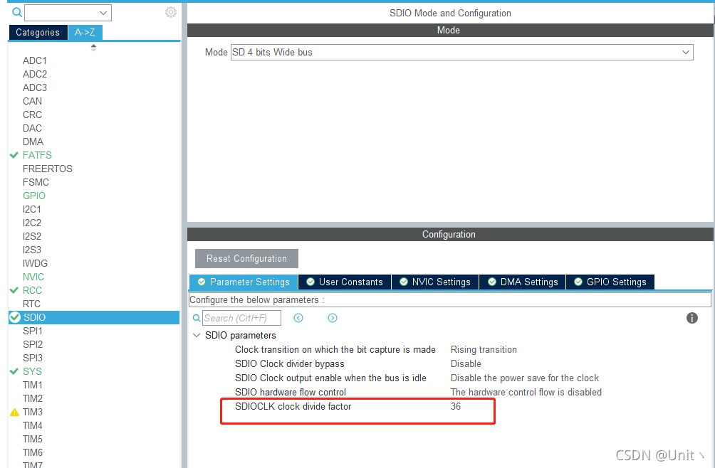 ? ? ? ? 我用的是4线 Bit的配置,时钟尽量不要太高,我这里用了36分频,最终具体的频率要自己算一下。
