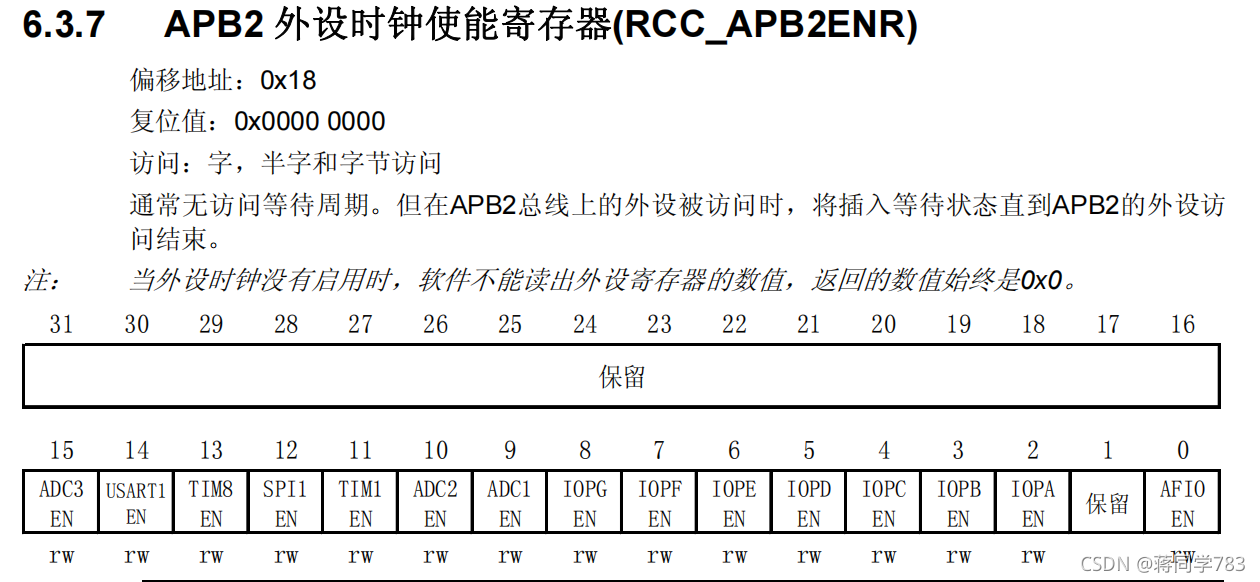 例如:如果我要使用GPIOB口时:注意到GPIOB,是在APB2总线上的,因此要打开APB2时钟寄存器中的GPIOB的时钟