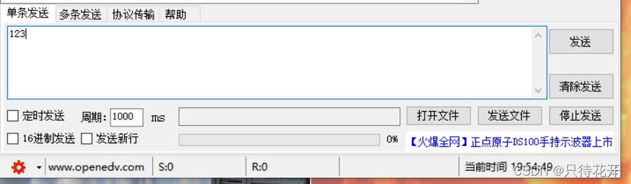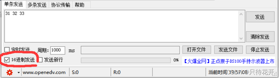?我们在单条发送的输入框里面输入123,然后勾选16进制发送,看看输入框里的变化成了什么: