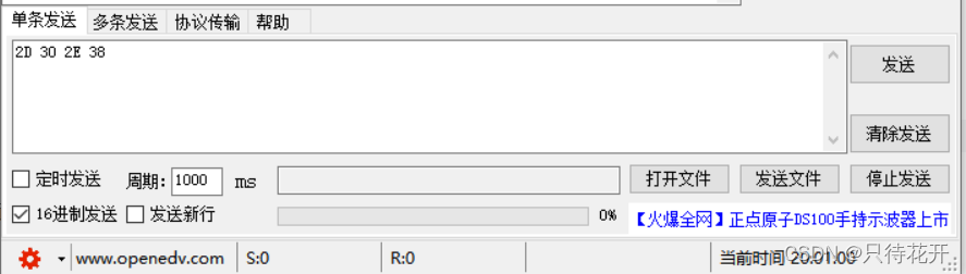 它发送的就是0x30 0x2E 0x38,我们可以容易的发现小数点 '.' 字符对应的16进制是0x2E,这个很重要,作为我们判断小数的一个依据,那如果我们发-0.8呢:?