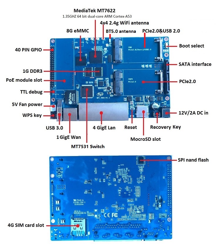 HardWare Specification of Banana pi BPI-R64 | CPU | MediaTek MT7622,1.35GHZ 64 bit dual-core ARM Cortex-A53 | SDRAM | 1 GB DDR3 | SATA | support 1 SATA interface | GPIO | 40 Pins Header, 28×GPIO, some of which can be used for specific functions including UART, I2C, SPI, PWM, I2S. | On board Network | 5 10/100/1000Mbps Ethernet | Wifi | built-in 4x4n 802.11n (800Mbps) sysem-on-chip and MTK7615 4x4ac wifi Module (1733Mbps) (option) | Bluetooth | Bluetooth 5.0 system-on-chip | On board Storage | MicroSD \(TF\) card,8GB eMMC onboard | mini PCIE | 1 mini pcie interface for 4G | USB | 1 USB 3.0 host | Buttons | Reset button | Leds | Power status Led and RJ45 Led | IR | PIN define with GPIO | DC Power | 12V/2A with DC in | POE | support POE module interface,can add POE module | Sizes | 148 mm × 100.5mm | Weight | 100g |
