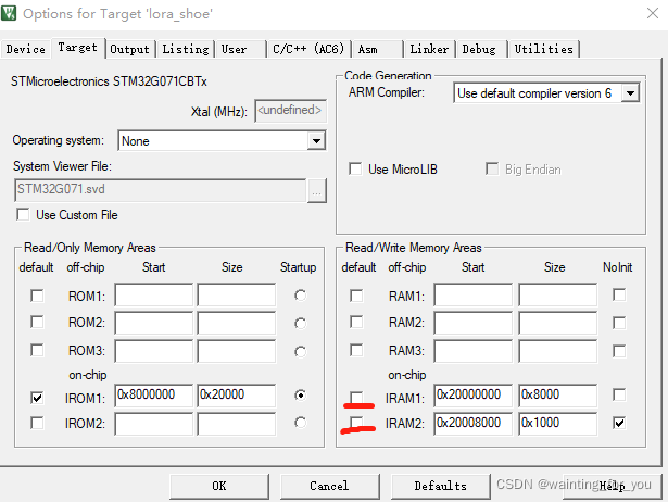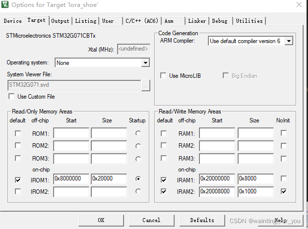 LR_IROM1 0x08000000 0x00020000 ?{ ? ?; load region size_region ? ER_IROM1 0x08000000 0x00020000 ?{ ?; load address = execution address ? ?*.o (RESET, +First) ? ?*(InRoot$$Sections) ? ?.ANY (+RO) ? ?.ANY (+XO) ? } ? RW_IRAM1 0x20000000 0x00008000 ?{ ?; RW data ? ?.ANY (+RW +ZI) ? } ? RW_IRAM2 0x20008000 ?0x00001000 ?{ ? ?*(.RAM_D1) ? } }