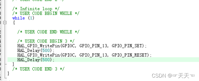 然后在keil中打开这个工程,在main函数中的while循环中添加如下语句: