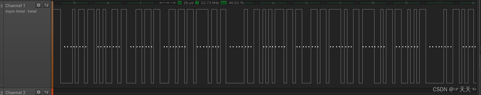 ?最后再分析PA9的串口通信发送的数据,经过放大之后我们得到如下图所示波形:(从下图可以很直观地看到传输的数据为hello“uc/OS”,这与我们通过串口得到的数据是一致的。)