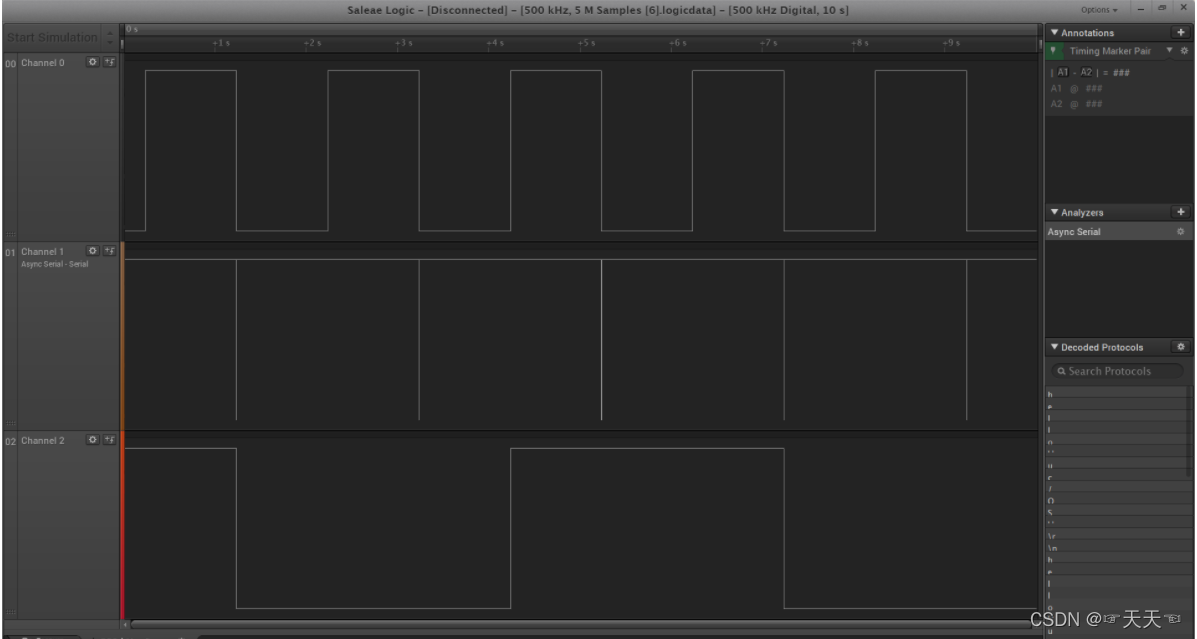 ? ? ? 此处使用的逻辑分析仪 ? ? ? 这次进行波形分析的管脚是PA3、PC13和USART1_SR,因此我们需要将硬件逻辑分析仪预留三个通道分别接最小系统板的PA3、PC13和PA9。进行波形采样得到的波形如图:
