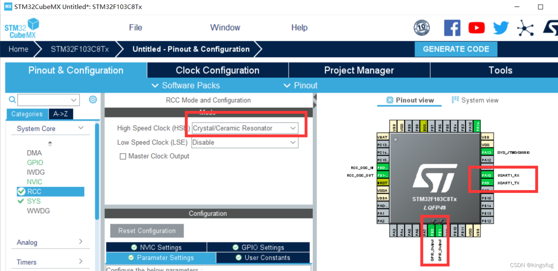 设置gpio管脚PB0,PB1来观察两个task任务下的led闪烁,并且设置串口usart1,中断不用开启。同时要设置sys,rcc,以及clock72MHZ