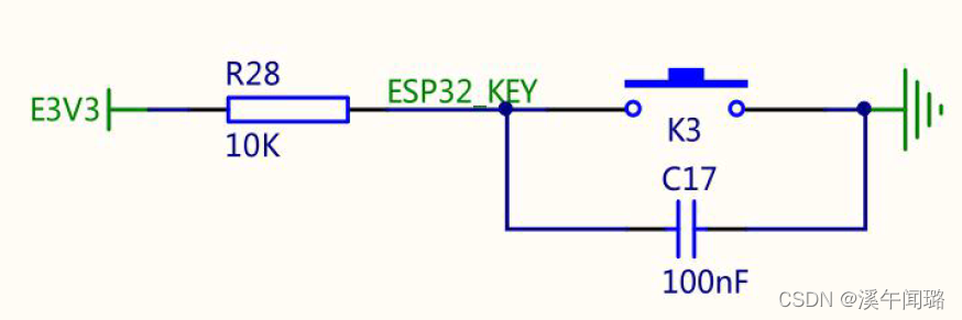 ? ? ? ? ?按键连接的原理图如下,按键没有被按下的时候,GPIO引脚的输入状态为高电平(按键所在的电路不通,引脚通过电阻接3.3V),当按键按下时,GPIO引脚的输入状态为低电平(按键所在的电路导通,引脚接GND。因此,只要检测到引脚的输入电平为低电平,证明按键被按下。