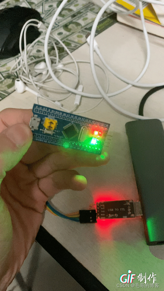 板子上运行效果如下(可以看到PC13和RXD的指示灯在闪烁,说明在发送数据):