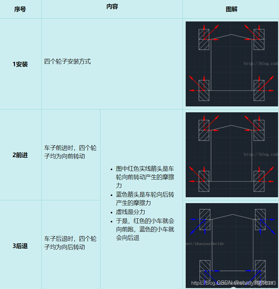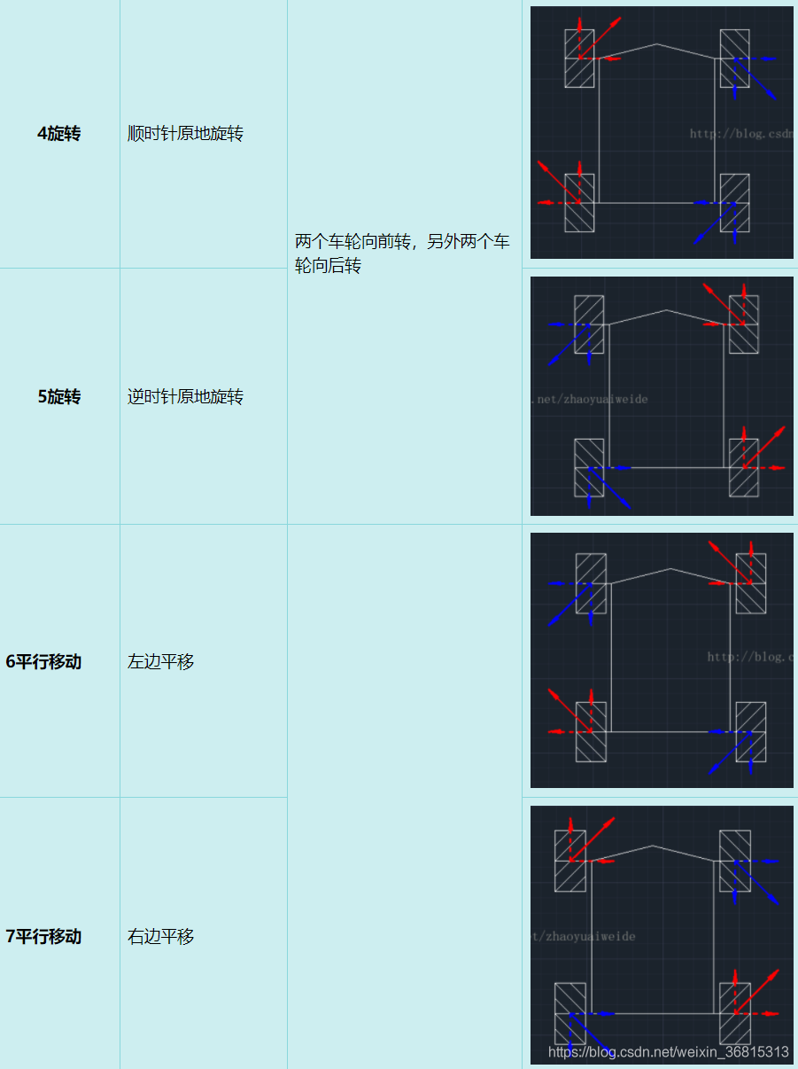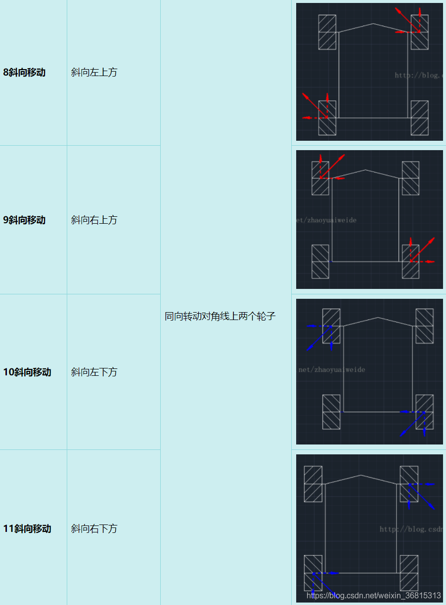 了解向各个方向移动与各轮转向的关系后,就可通过调节与各轮转向相关的高低电平引脚模式来实现全向移动了。