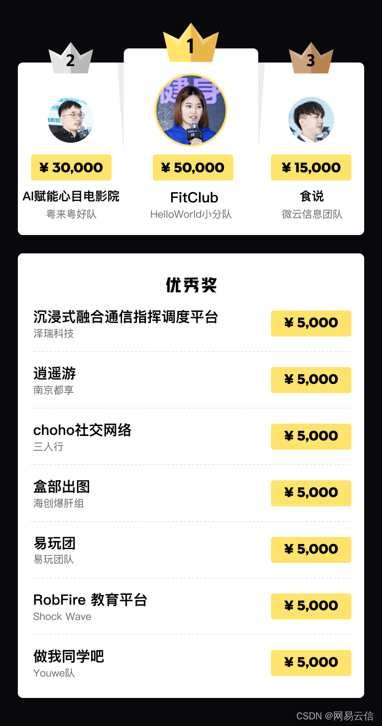 网易智企副总经理、网易云信总经理陈丽表示:近几年,依托于技术和人才优势,中国已经拥有了全球规模最大的应用开发者群体。一直以来,网易云信也始终保持对开发者们的重视,为开发者们提供良好的资源和平台,助力其打造优质的产品应用。本次大赛前三名将分别获得50000元、30000元和15000元的奖金,同时我们也非常渴望优秀选手的加入,所有十强队伍成员都将获得“网易云信招聘绿色通道”资格,参与招聘时可直接进入 CTO 终轮面试,有机会优先获得网易工作机会和实习 offer。