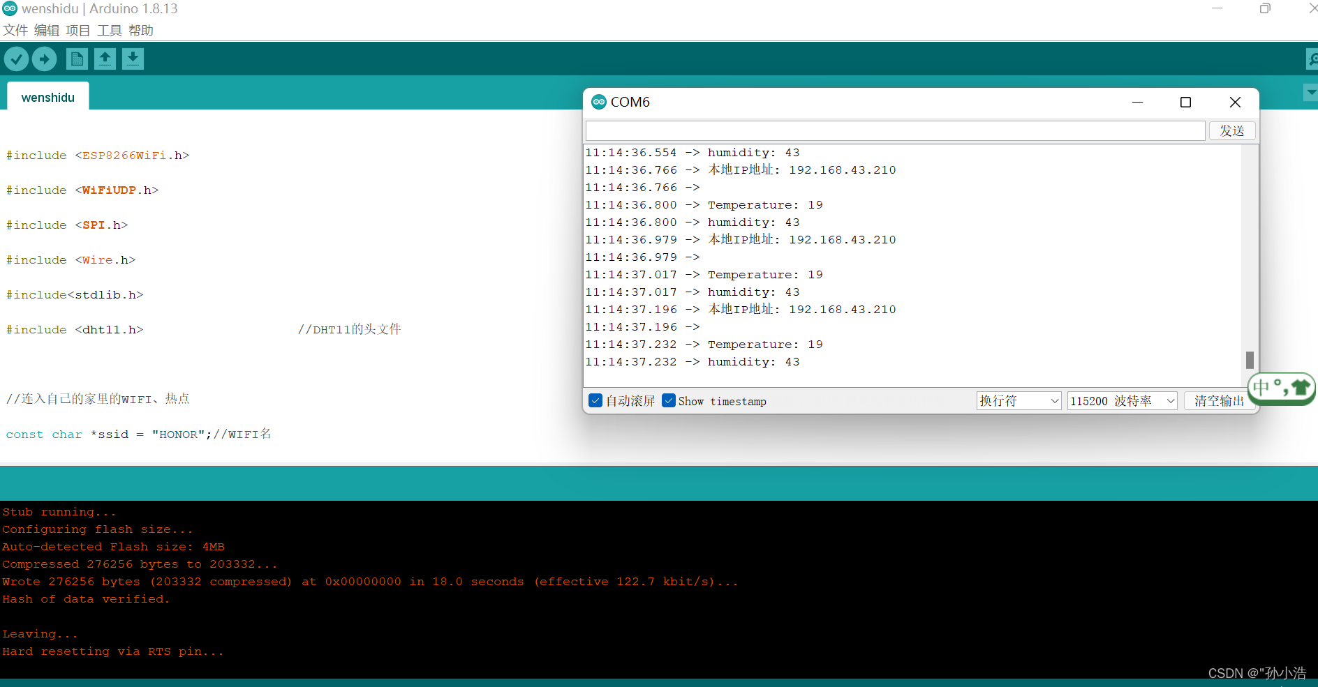 环境:Arduino IDE,esp8266单片机,DHT11温湿度传感器,路由器,UDP