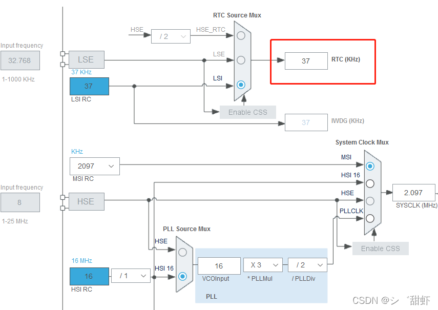先看下STM32L053的RTC时钟,这里没有外部晶振用的是内部LSE,频率37KHz