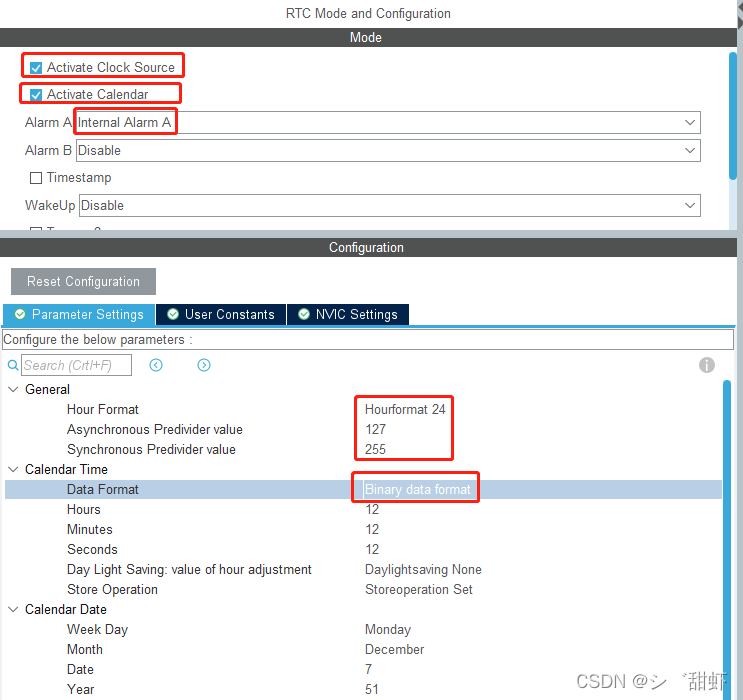 ?通过Cube配置RTC,启用日历和时钟,我这里开启了一个RTC中断,用来唤醒休眠中的单片机