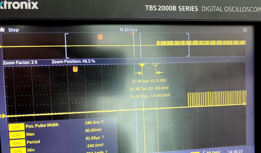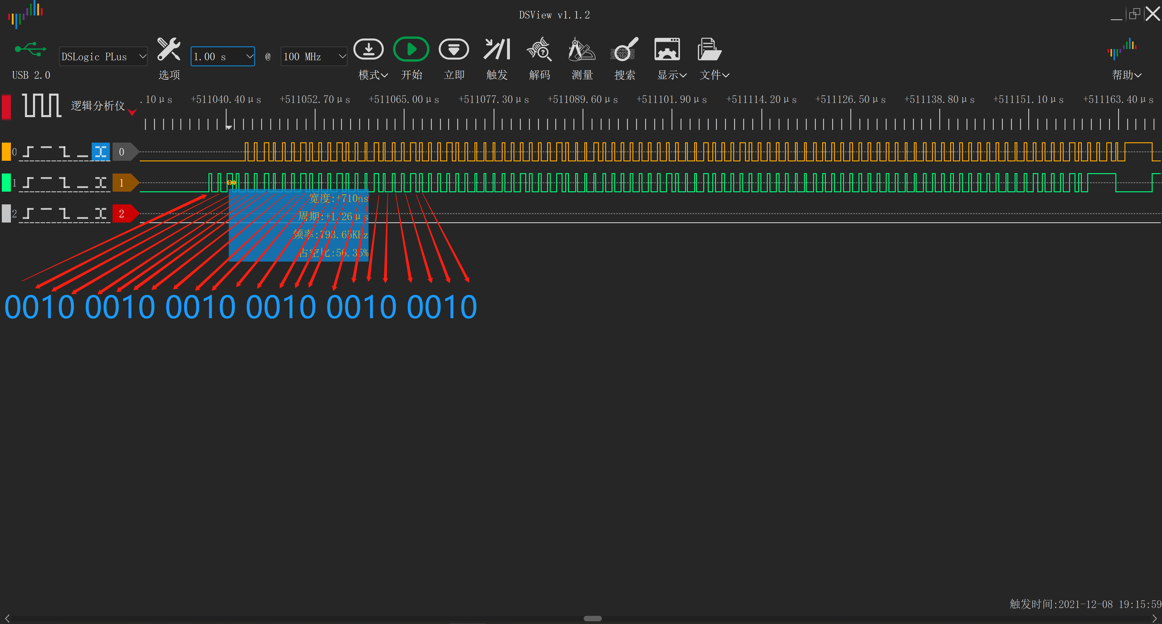 这里一共4个灯那么,如下图是抓出来的,可以看到数据是一致的,另外上下两个波形差了点位置,说明CPU代码执行先后是时间有间隔的。