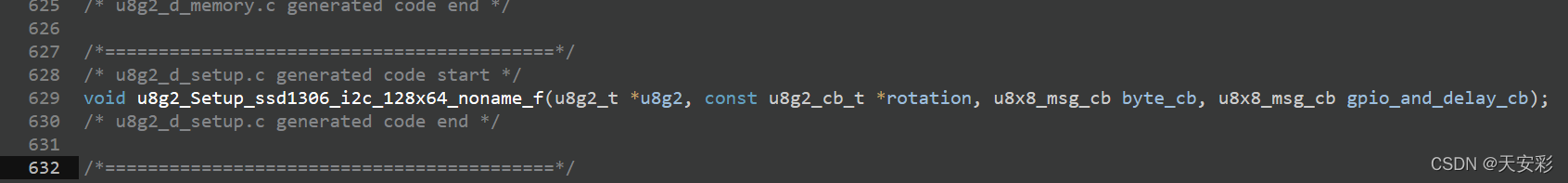 4.修改"u8g2_d_setup.c"这个文件,删除其他函数只留下自己器件相关的。由于我用的硬件IIC,而且因为自己单片机空间较大所以选择后缀为f的函数使用,即我选择的是"u8g2_Setup_ssd1306_i2c_128x64_noname_f"这个函数,其他都删除了。当然也可以使用后缀为1或者2的函数,比较省空间,但是自然的会比较耗时。具体差距百度也有。该文件最后如下: