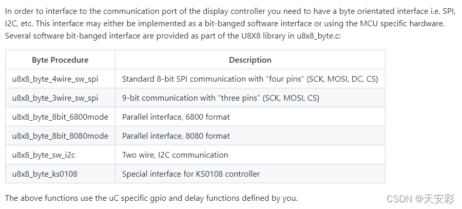 ????????调用第四步剩下的u8g2_Setup_ssd1306_i2c_128x64_noname_f()这个函数来初始化,第一个参数是一个空的结构体地址,第二个参数表示是否旋转,第四个参数是我们写的gpio的那个回调函数名字,第三个参数是我们写的另外一个回调函数名或者我截图表格里那几个模拟时序的函数名。