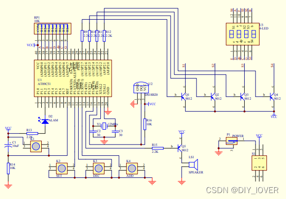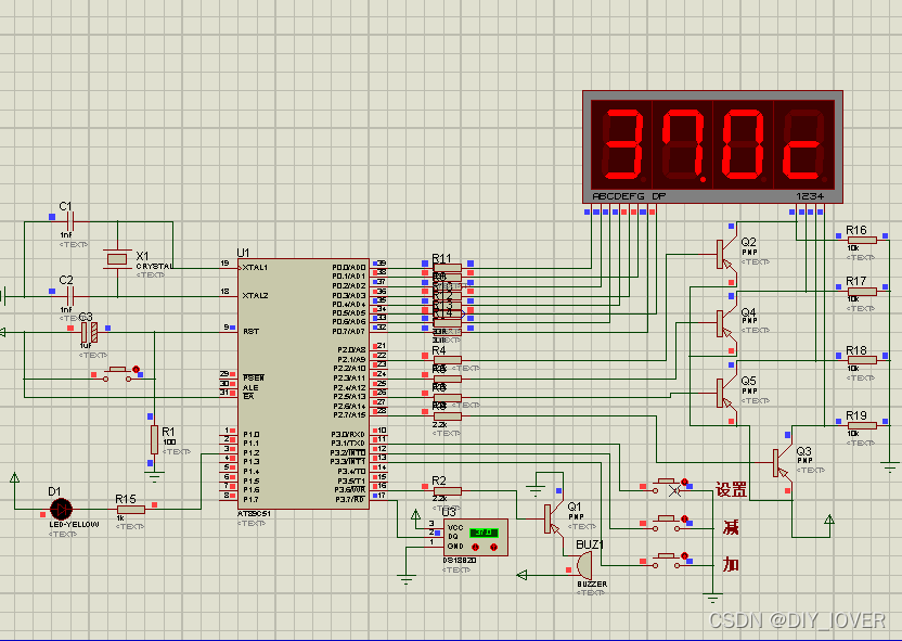 一、? ? 概述: 主要实现:实时温度测量及显示,超出温度范围声光报警,上下限温度可通过按键设定等功能。 本数字温度报警器是基于51单片机及温度传感器DS18B20来设计的,温度测量范围0到99.9摄氏度,精度为0.1摄氏度,可见测量温度的范围广,精度高的特点。可设置上下限报警温度,默认上限报警温度为38℃、默认下限报警温度为5℃(通过程序可以更改上下限值)。报警值可设置范围:最低上限报警值等于当前下限报警值,最高下限报警值等于当前上限报警值。将下限报警值调为0时为关闭下限报警功能。