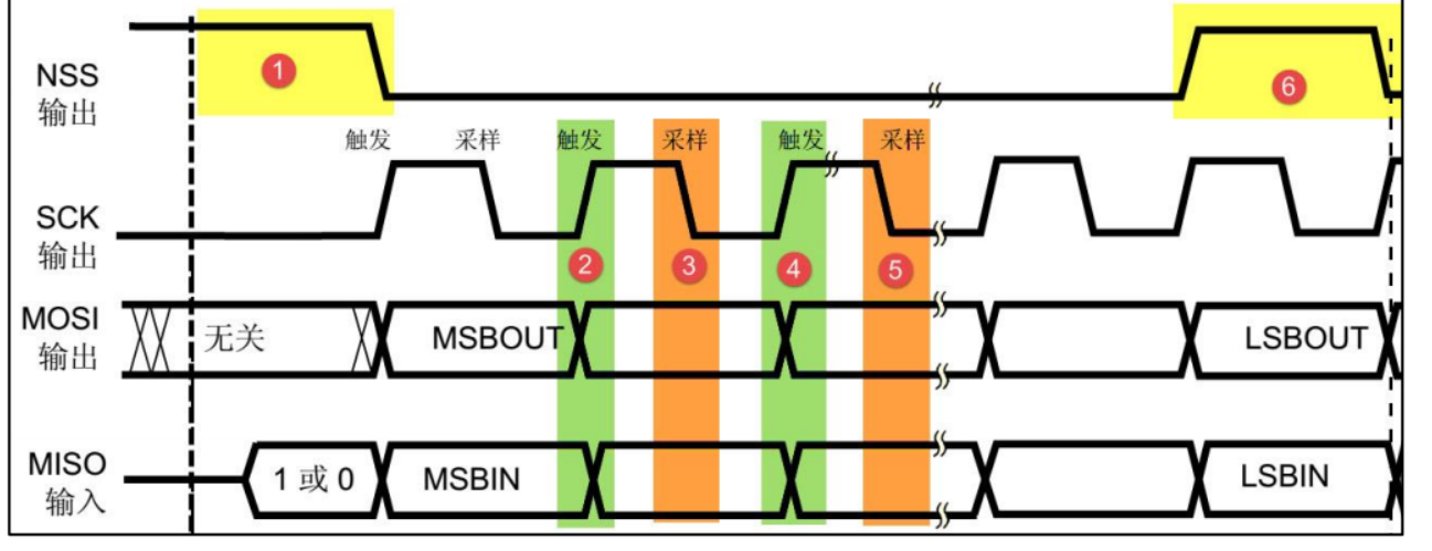 在图 中的标号① 处, NSS 信号线由高变低,是 SPI 通讯的起始信号。 NSS 是每个从机各自独占的信号线,当从机在自己的 NSS 线检测到起始信号后,就知道自己被主机选中了,开始准备与主机通讯。在图中的标号⑥ 处, NSS 信号由低变高,是 SPI 通讯的停止信号,表示本次通讯结束,从机的选中状态被取消。