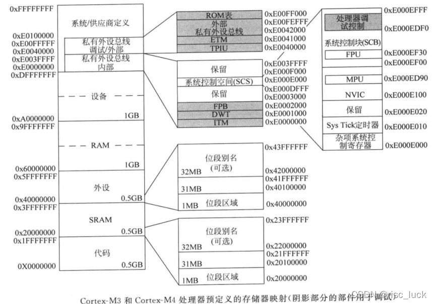 | 代码 | 0x00000000 ---- 0x1FFF FFFF | 512MB的存储器空间,主要用于程序代码,包括作为程序存储器一部分的默认向量表,该区域也允许数据访问 | | SRAM | 0X20000000 —0X3FFFFFFF | SRAM区域位于存储器空间中的下一个512MB,主要用于连接SRAM,其大都为片上SRAM,不过对存储器的类型没有什么限制。若支持可选的位段特性,则SRAM区域的第一个1M可位寻址,还可以在这个区域中执行程序代码。 | | 外设 | 0x40000000 — 0x5FFFFFFF | 外设存储器区域的大小同样为512MB,而且多数用于片上外设。和SRAM区域类似,若支持可选的位段特性,则外设区域的第一个1MB是可位寻址的。 | | RAM | 0x60000000 — 0x9FFFFFFF | RAM区域包括两个512MB存储器区域(总共1GB),用于片外存储器等其他RAM,且可存放程序代码和数据 | | 设备 | 0xA0000000—0xDFFFFFFF | 设备区域包括两个512MB存储器空间(总共1GB),用于片外外设等其他存储器 | | 系统 | 0xE0000000 — 0XFFFFFFFF | 系统区域可分为几个部分:①内部私有外设总线(PPB),0XE0000000 ----0XE003FFFF PPB用于访问NVIC 、SysTick、MPU等系统部件,以及Cortex-M3/M4内的调试部件。多数情况下,该存储器空间只能由运行在特权状态的程序代码访问。 ②外部私有外设总线(PPB)0XE0040000 ----0XE00FFFFF 另外一个PPB区域可用于其他的可选调试部件,芯片供应商也可以增加自己的调试或其他特定部件。该存储器空间只能由运行在特权状态的程序代码访问。需要注意的是,该总线上调试部件的基地址可能会被芯片设计者修改。③供应商定义区域 0xE0100000 — 0XFFFFFFFF 剩下的存储器空间用于供应商定义的部件,多数情况下是用不上的 |