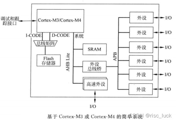 在简单的微处理器设计中,程序存储器一般会被连接到I-CODE 和D-CODE总线,而SRAM和外设则会被连到系统总线。cortex-m3或cortex-m4的一种简单设计如下图所示: