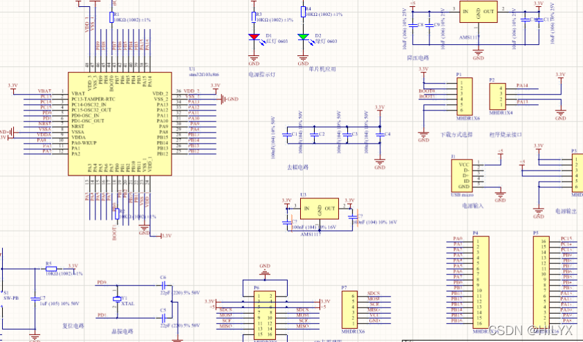 何为stm32 最小系统的电路原理图 最小系统为单片机工作的最低要求,不含外设控制,原理简单,分析最小系统是嵌入式入门的基础。 stm32 最小系统的电路原理图如下,我们的目标就是绘制出下面的原理图。