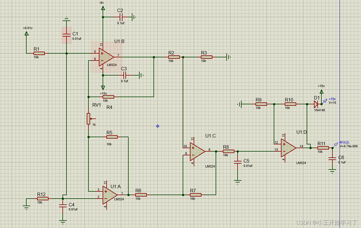 实验内容:1.?设计一个可变增益的仪用放大电路,实现对输入信号的放大,增益范围1~1000倍,输出电压范围0~10V;2.?运用proteus或multisim软件画出仿真电路,运行仿真;上述是题目,下面是分析和仿真。本文采用的是LM324,其他的类似的芯片(LM22、LM324A)也可以替换