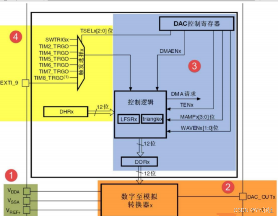2个DAC转换器 8位或12位单调输出 12位模式下数据的左对齐或者右对齐 同步更新功能 噪声波形生成 三角波形生成 双DAC通道同时或者分别转换 每个通道都有DMA功能