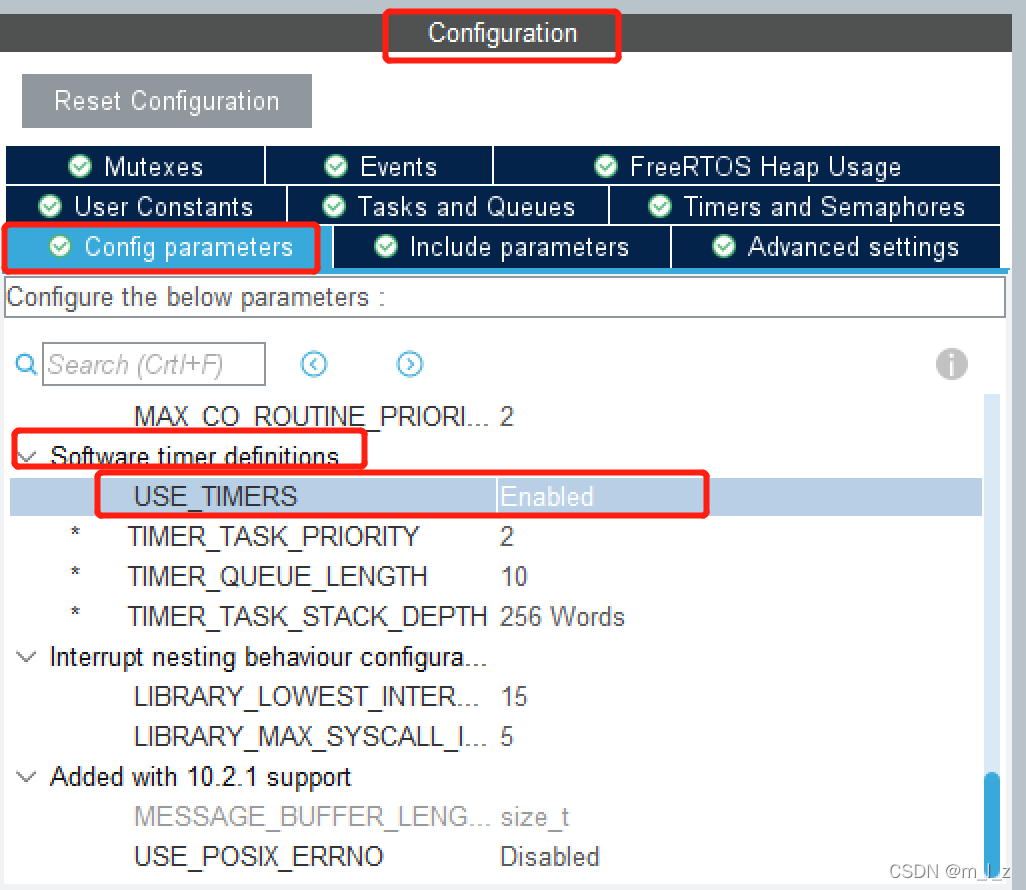 1、在STM32CubeMX 首先找到Config parameters这个选项下的Software timer definitions,然后将USE_TIMERS设置为Enable